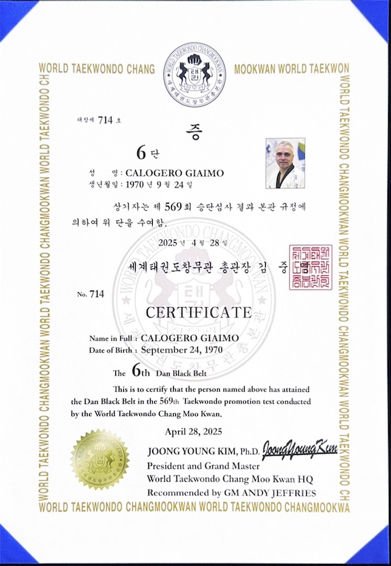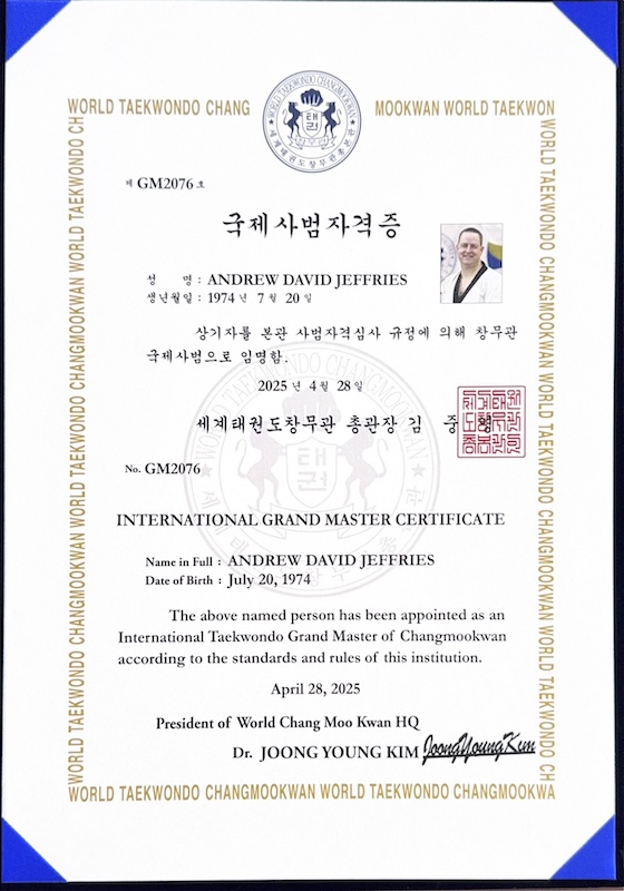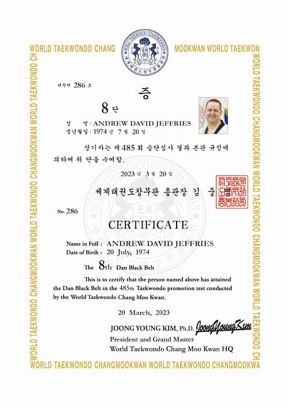 ChairmanA Changmookwan 8th Dan and Kukkiwon 6th Dan, has received multiple awards from Kukkiwon. Qualified from the Kukkiwon's Master Instructor Course (with citations) and Poom/Dan Examiner Course. Speaks conversational level Korean and has been to Korea nearly 10 times to train with the world's best grandmasters. Also holds a blue belt in Brazilian Jiu Jitsu.